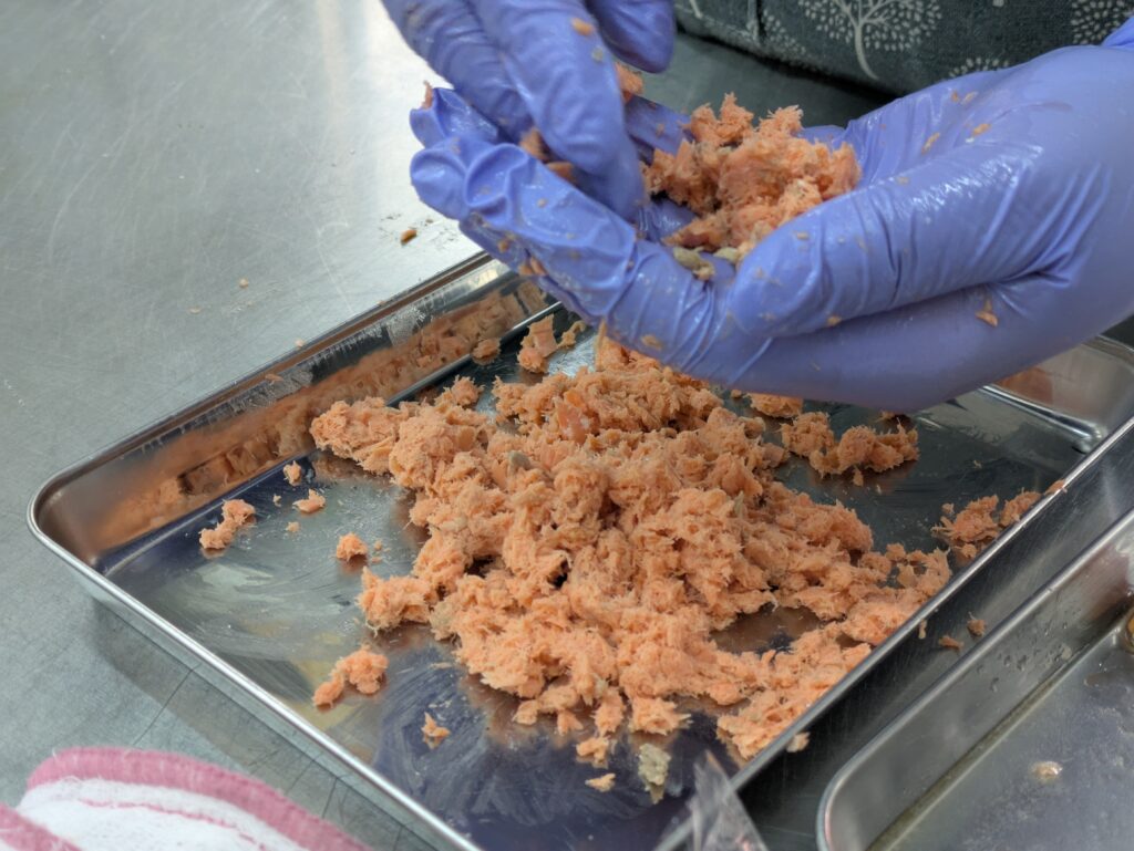 役割分担をして厨房内で焼いた鮭の身をほぐしたり、