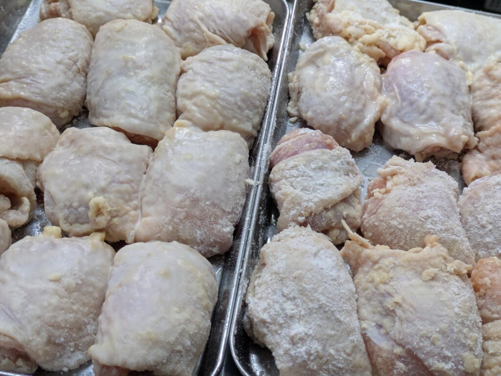 唐揚げの衣付けはレシピ通りに粉を測って混ぜて、お肉に纏わせます。