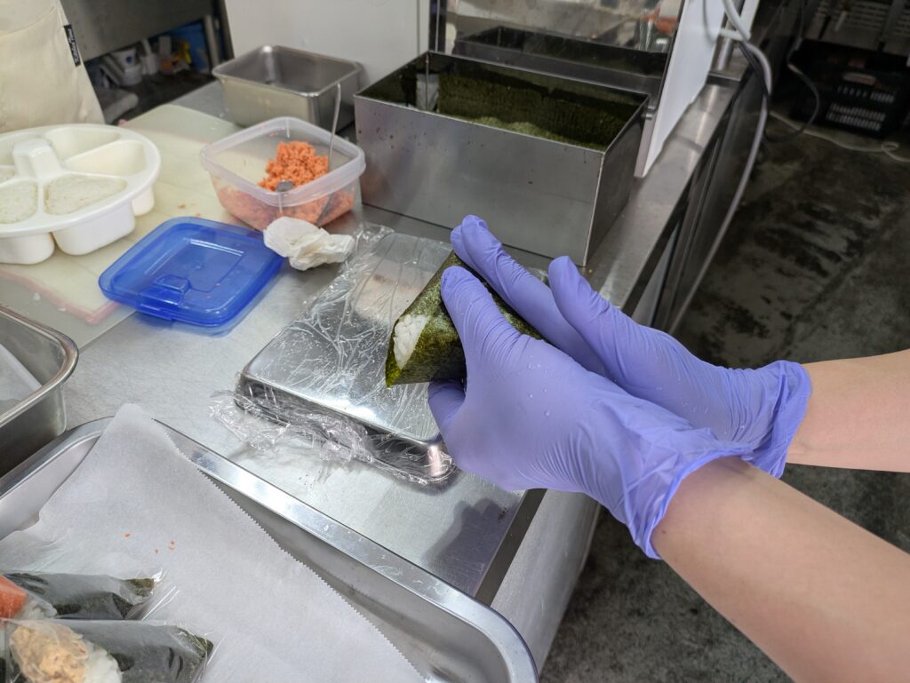 お米を測る係、握る係、海苔を巻く係、フィルムを巻く係、に分かれて