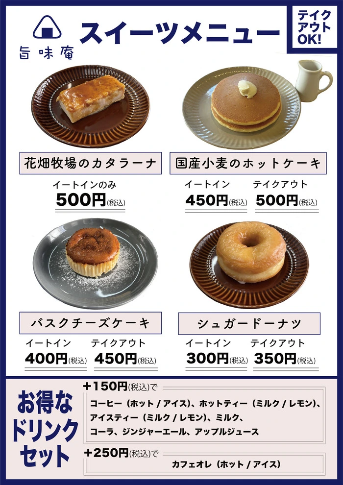 旨味庵では新たにドリンク、スイーツのテイクアウトができるようになりました!